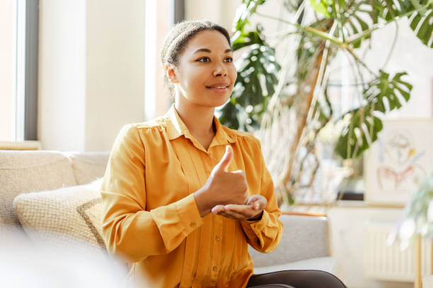 African American deaf sign language teacher communicating by hands gestures at light colours cafeteria. Deafness concept